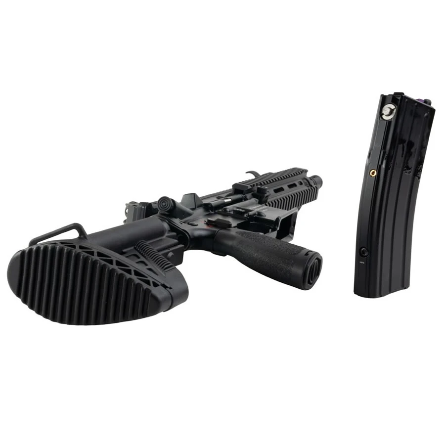 Buffer tube 6 posisi dengan E1 stock ergonomis, dilengkapi sling mount dan ruang penyimpanan baterai atau CO₂